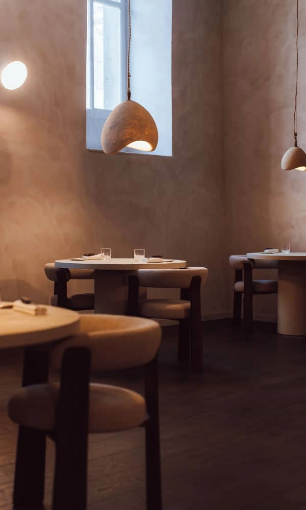 Le projet visait à créer un lieu sobre et affirmé, où l’architecture intérieure met en valeur la gastronomie sans en faire trop. L’ensemble repose sur des matières brutes, beaucoup de courbes, du bois et une lumière douce, pensée pour installer une atmosphère chaleureuse et feutrée.