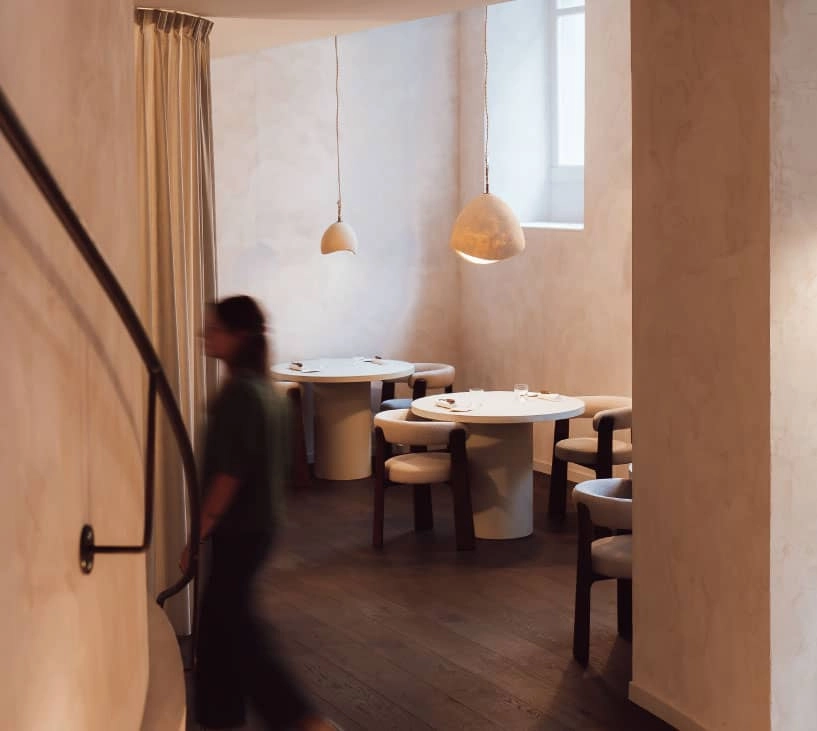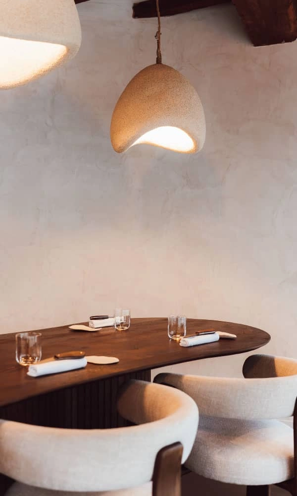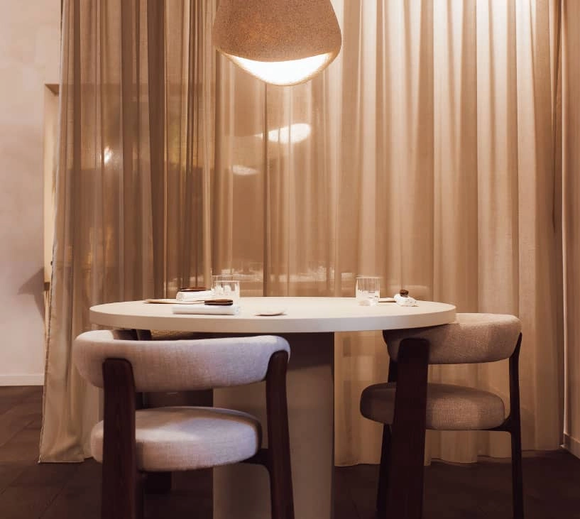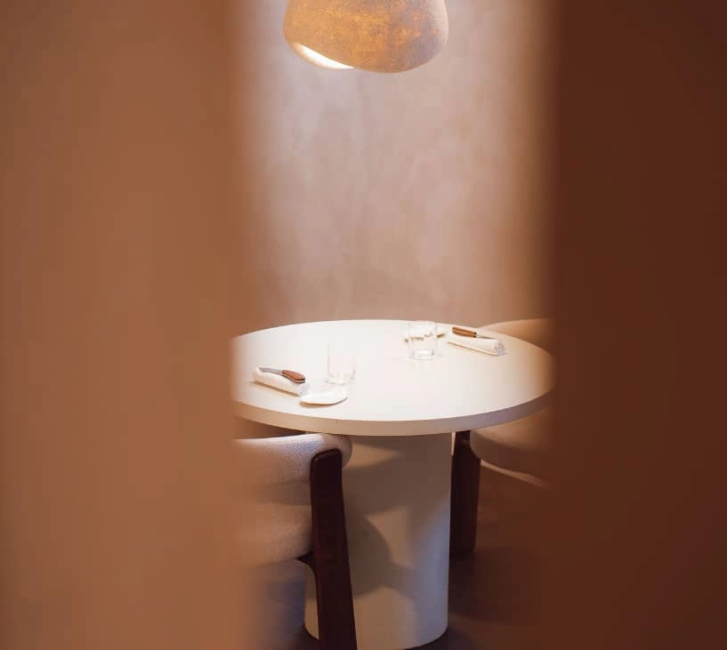 Du mobilier aux finitions, chaque choix a été fait pour rester dans une même logique : des formes simples, des lignes douces et une palette de matières sobres. L’ensemble crée un décor minimal, chaleureux et cohérent, au service de l’expérience culinaire.