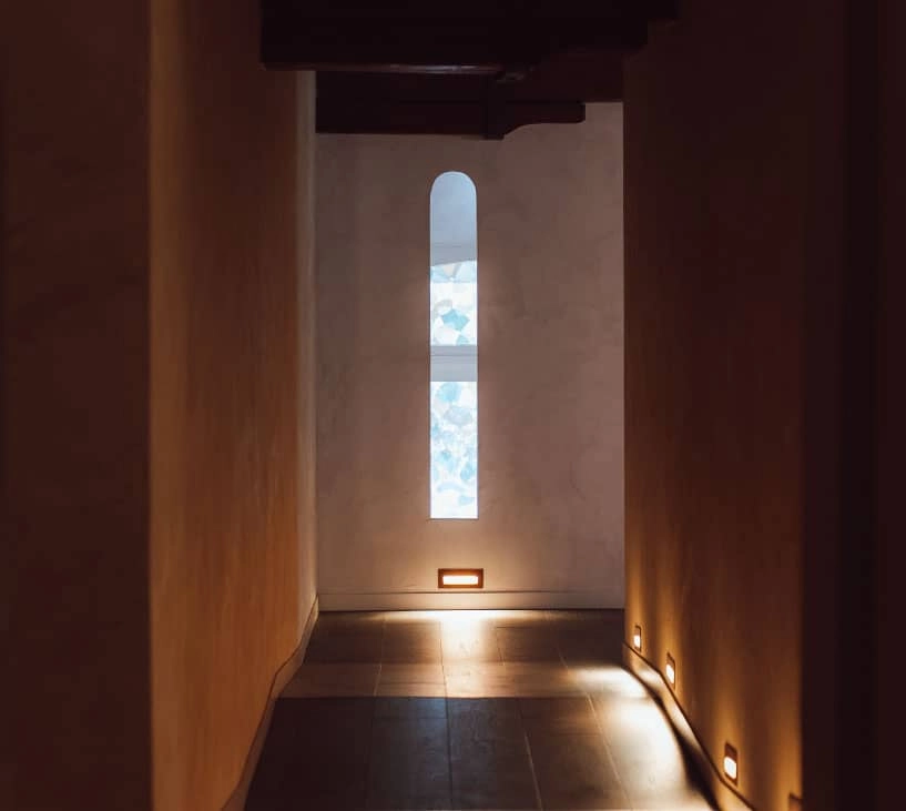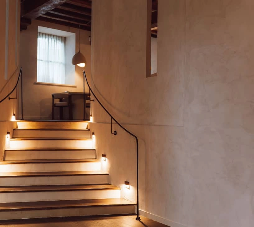 L’éclairage a été travaillé de manière volontairement discrète, avec des lumières tamisées et indirectes qui accompagnent les espaces sans les dominer.